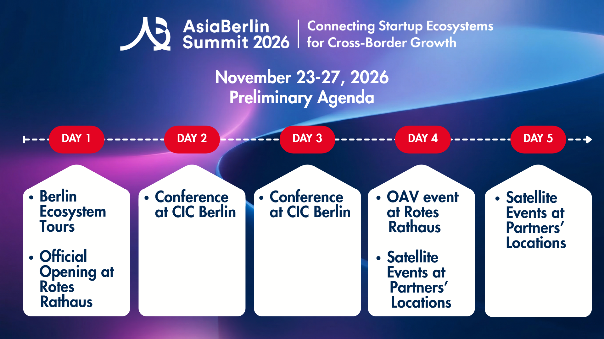As the flagship bridge between Berlin and Asia’s innovation hubs, we bring together founders, investors, corporates, and policymakers to turn cross-border exchange into practical collaboration – through curated programming, matchmaking, and partner-led activations across the city.