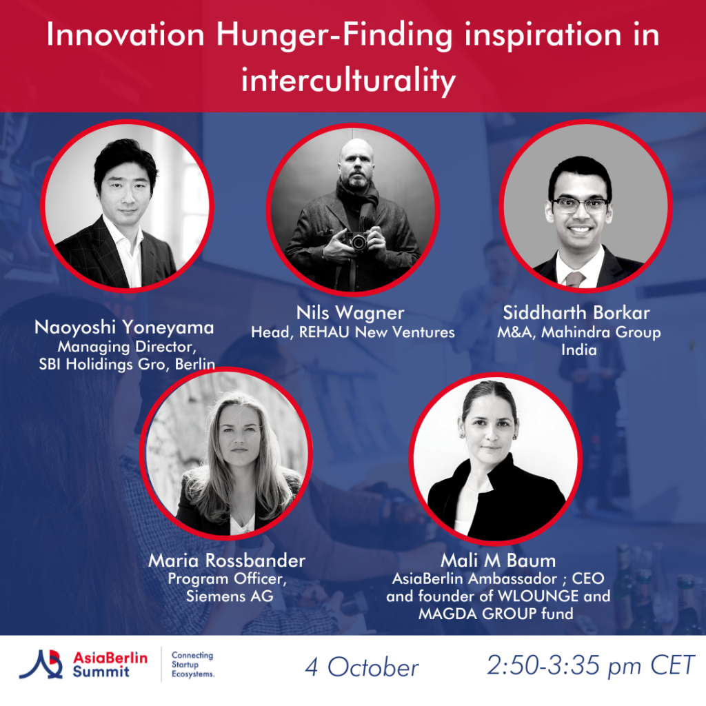 (Naoyoshi Yoneyama, Managing Director, SBI Holding, Nils Wagner, Head of REHAU New Ventures; Siddharth Borkar, M&A, Mahindra Group India; Maria Roßbander, Program Officer Siemensstadt², Siemens AG – Siemensstadt Square; moderated by Mali M Baum, CEO founder, WLOUNGE ,MAGDA GROUP fund)