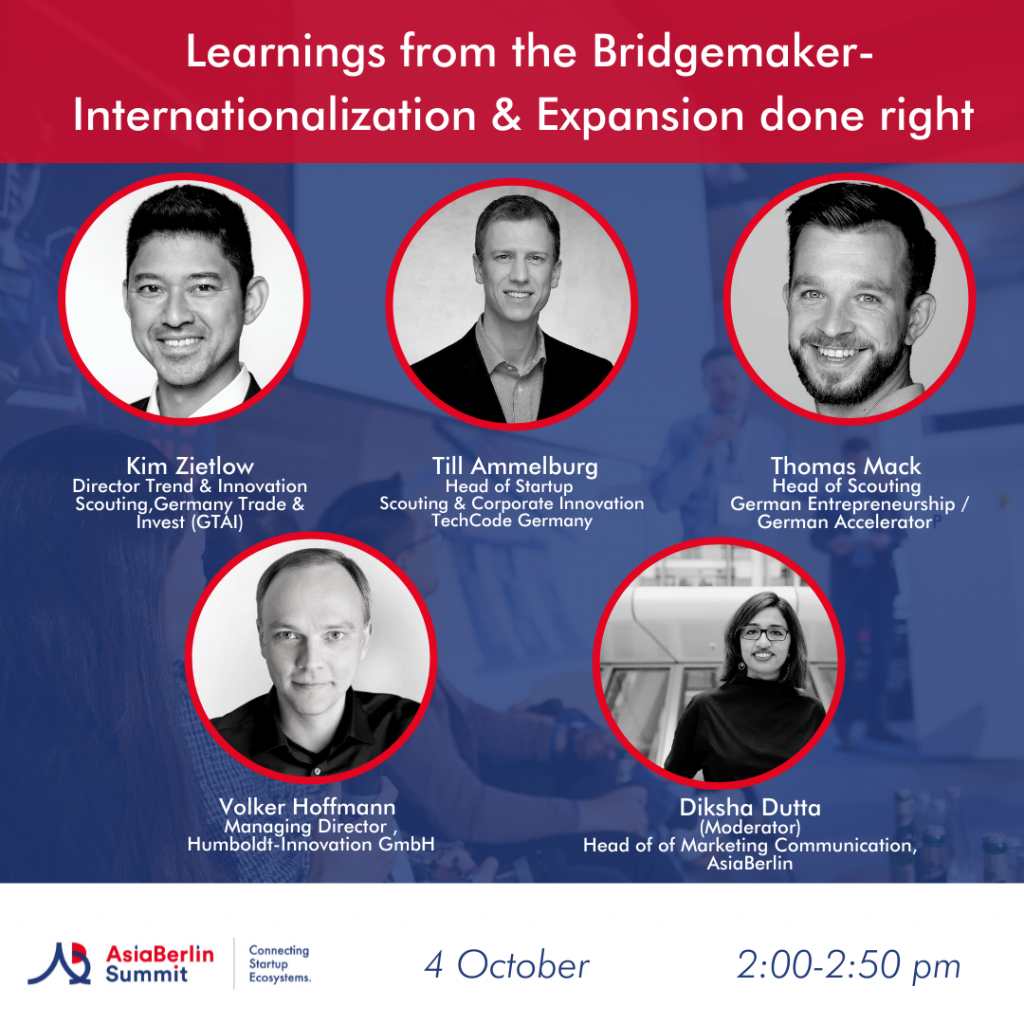 (Dr. Kim Zietlow , Director Trend & Innovation Scouting, Germany Trade & Invest / Digital Hub Initiative; Volker Hoffman , Managing Director, Humboldt-Innovation; Thomas Mack , Head of Scouting, German Entrepreneurship / German Accelerator; Till Ammelburg, Head of Startup Scouting & Corporate Innovation, TechCode Germany; moderated by Diksha Dutta, Head of Marketing & Communication, AsiaBerlin)